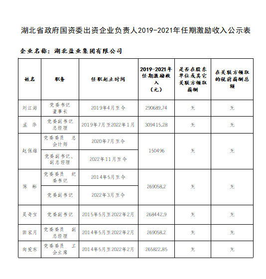 湖北省政府國資委出資企業(yè)負(fù)責(zé)人2019-2021年任期激勵收入公示表、湖北省政府國資委出資企業(yè)負(fù)責(zé)人2021年度薪酬公示表