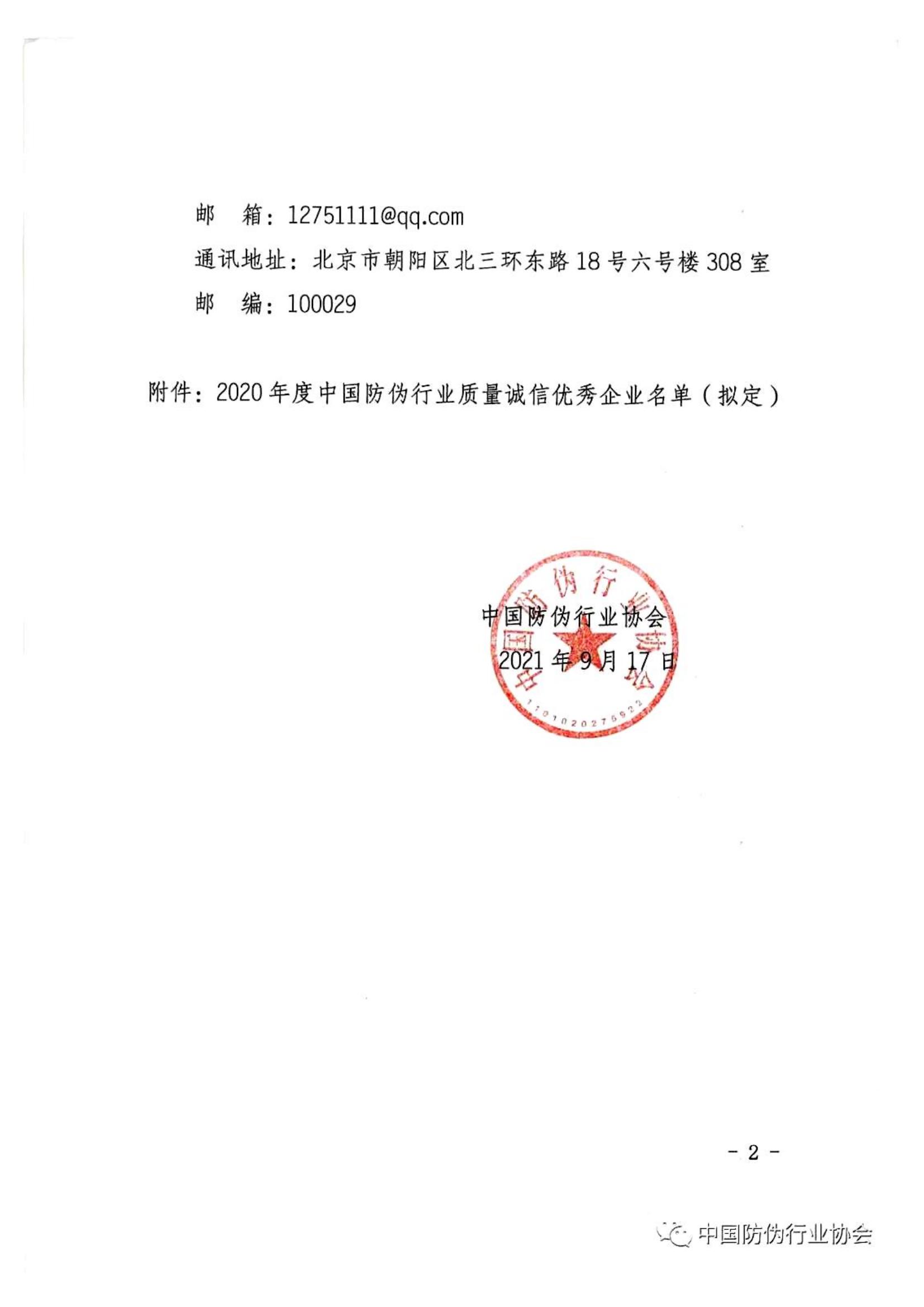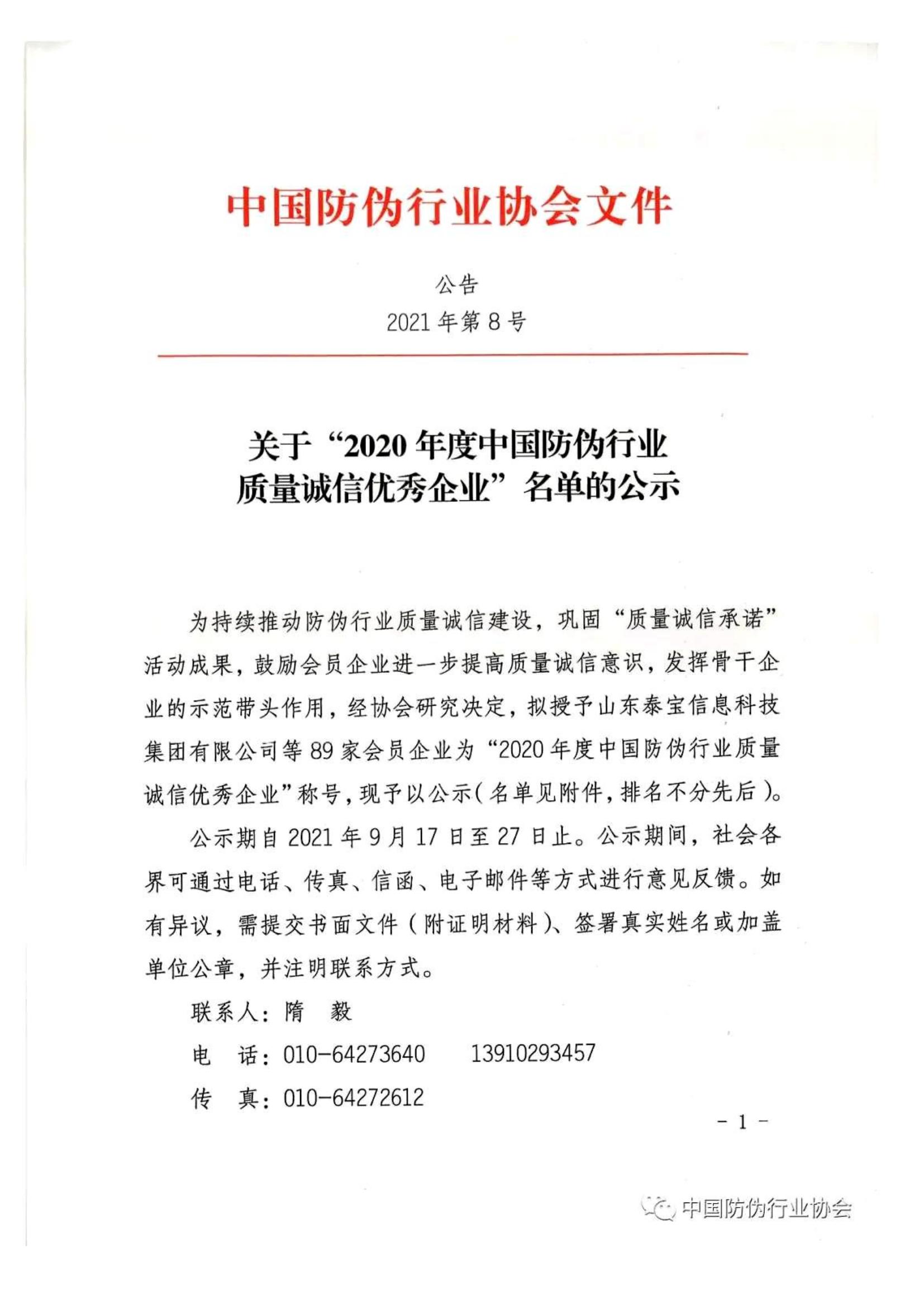 關(guān)于“2020年度中國(guó)防偽行業(yè)質(zhì)量誠信優(yōu)秀企業(yè)”名單的公示